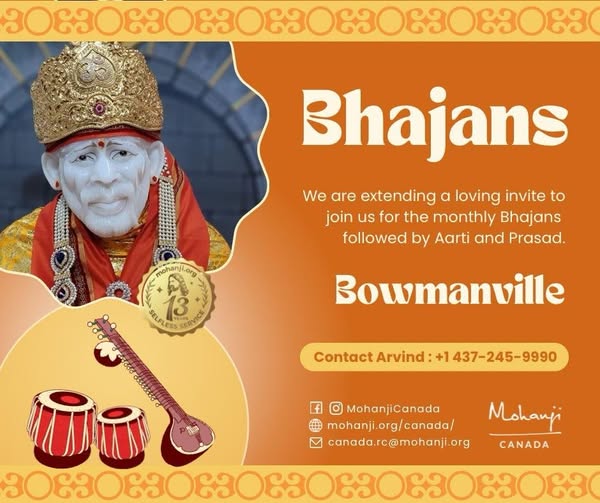 Bhajans We are extending a loving invite to please join us for the monthly Bhajans.Date : June 29th, SundayLocation: BowmanvilleTime: 3 pm EDTFor details and RSVP contact Arvind at+1 437-245-9990