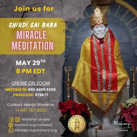 Shirdi Saibaba Miracle Meditation ππ‘π’π«ππ’ πππ’ππππ ππ’π«πππ₯π ππππ’ππππ’π¨π§Join us this evening for a divine experience!Let your heart open to grace in the Shirdi Sai Baba Miracle Meditation Date: 29th May 2025Time: 8 pm EDTOnline on ZoomMeeting ID: 881 5188 2166Passcode: 742891Come and soak in Babaβs loving embrace. Miracles await in His presence. Contact: Apprentice Acharya – Manjiri Bhalerao +1 6477678022